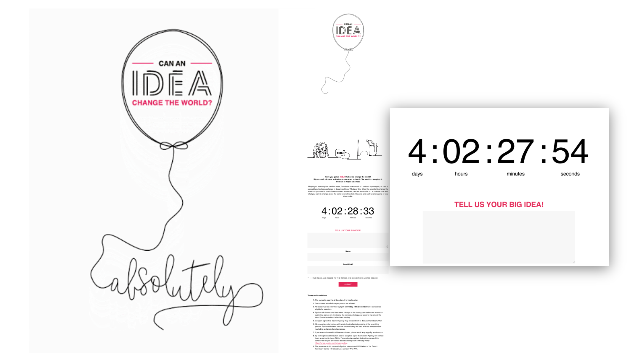 Each Googler received an unbranded balloon with the words “Can an idea change the world?”. The only way to find out? Pop it. Inside was a note leading to a landing page featuring a visually striking video, designed to inspire submissions of world-changing ideas—no matter how big, small, or outlandish.